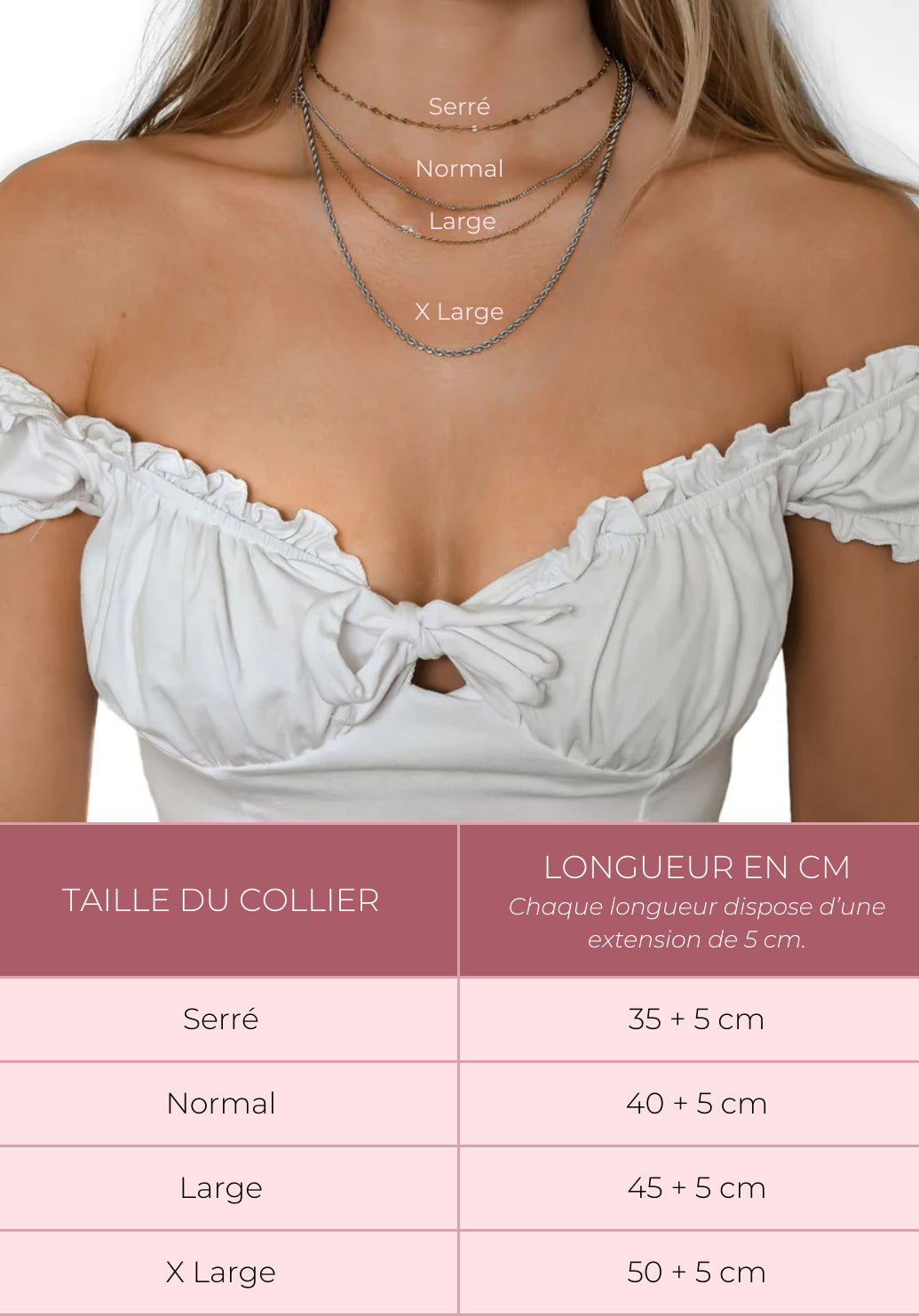 Nous proposons plusieurs tailles : 35–40 cm (Serré), 40–45 cm (Normal), 45–50 cm (Large), 50–55 cm (X Large). Consultez notre Guide des tailles pour choisir la longueur idéale.